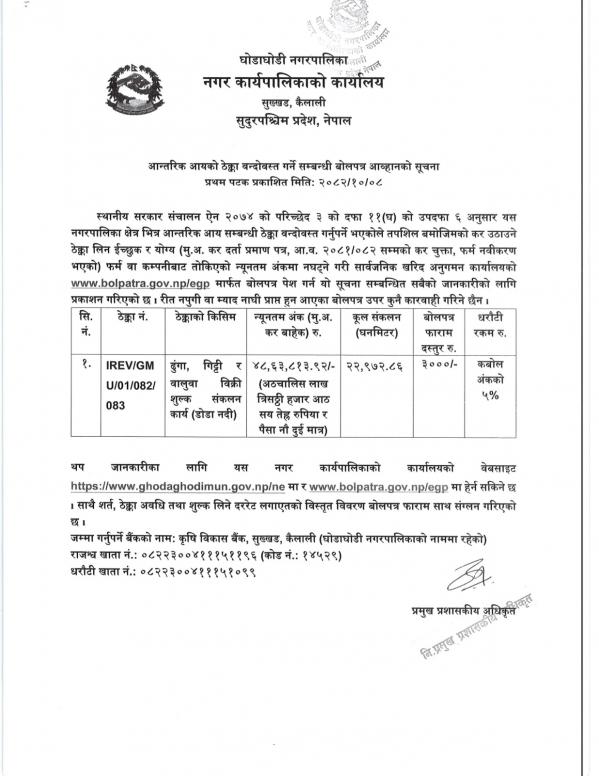 आन्तरिक आयको ठेक्का बन्दोबस्त गर्ने सम्बन्धी बोलपत्र आह्वानको सूचना । ठेक्का नंं. IREV/GMU/01/082/083