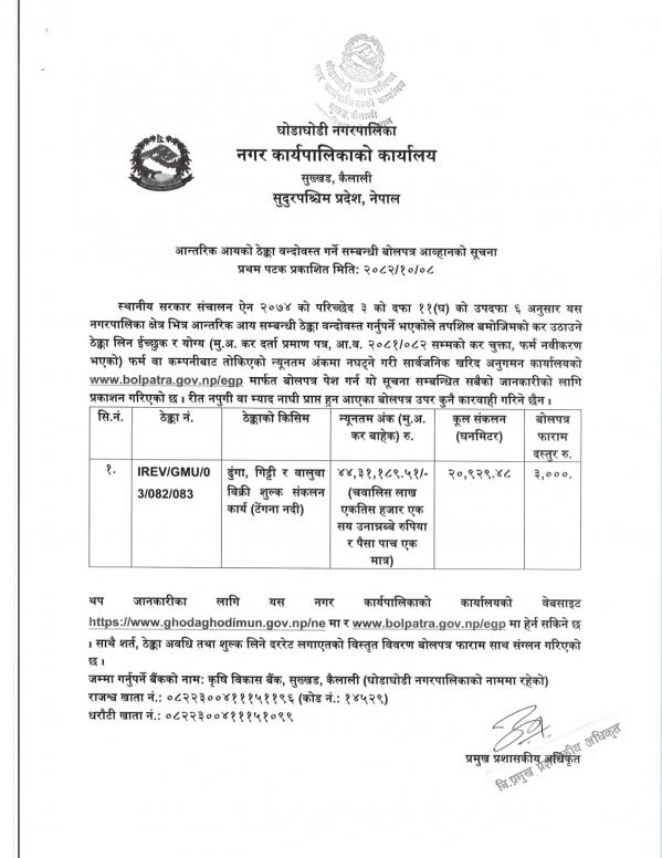 आन्तरिक आयको ठेक्का बन्दोबस्त गर्ने सम्बन्धी बोलपत्र आह्वानको सूचना । ठेक्का नंं. IREV/GMU/03/082/083