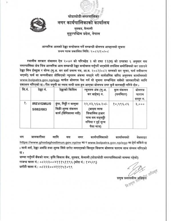 आन्तरिक आयको ठेक्का बन्दोबस्त गर्ने सम्बन्धी बोलपत्र आह्वानको सूचना । ठेक्का नंं. IREV/GMU/05/082/083