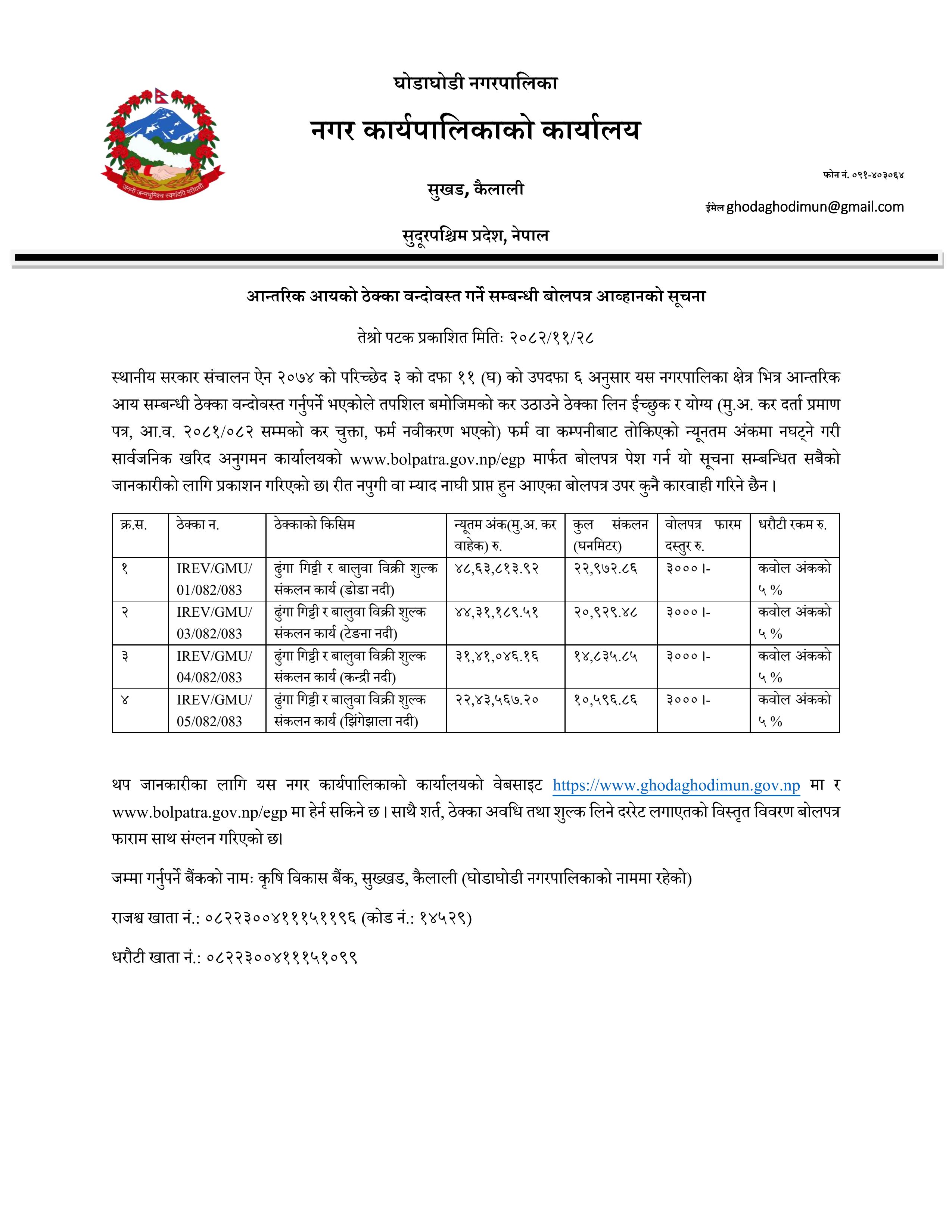 आन्तरिक आयको ठेक्का वन्दोवस्त गर्ने सम्बन्धी बोलपत्र आव्हानको सूचना तेश्रो पटक प्रकाशित मितिः २०८२/११/२८