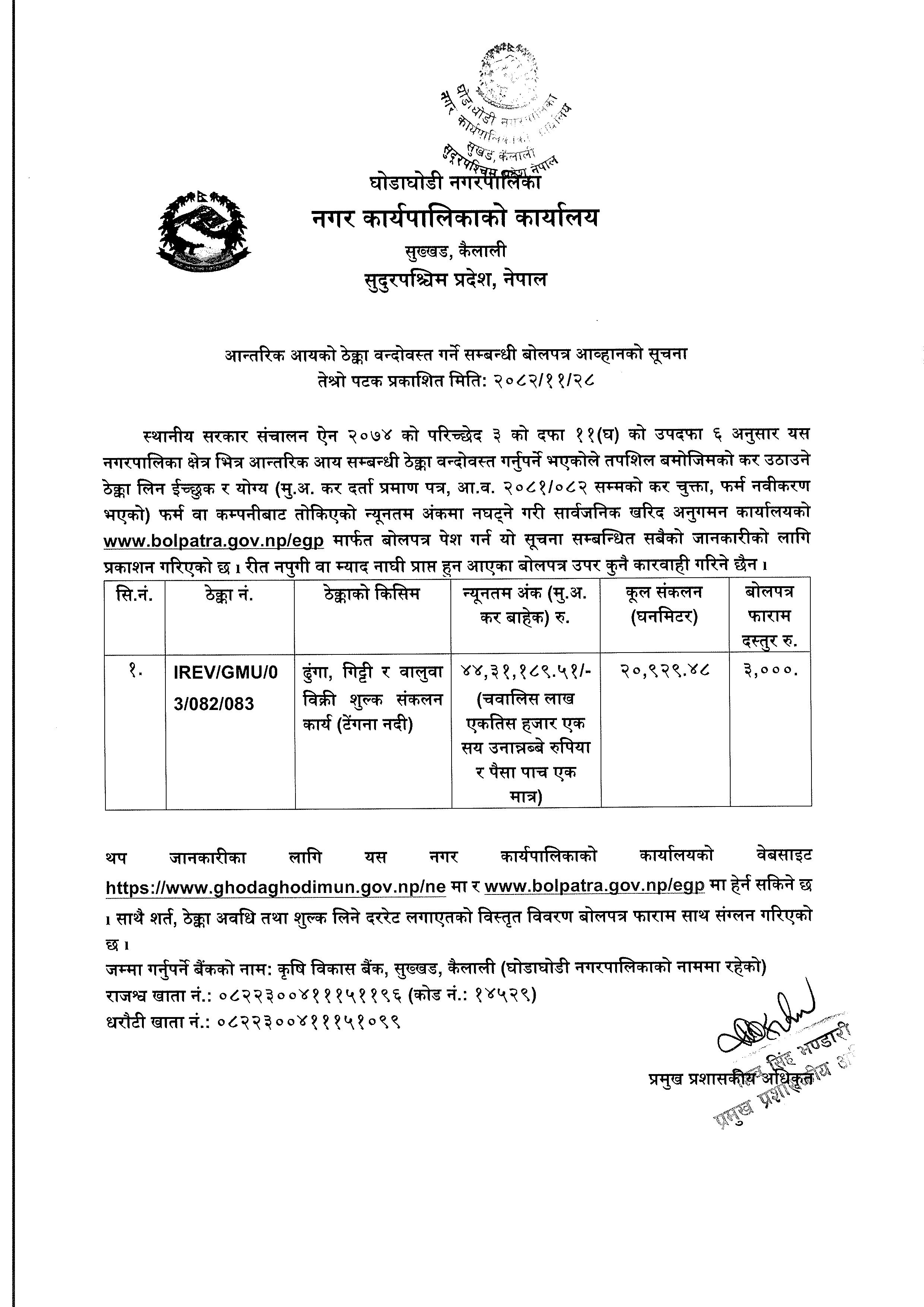 आन्तरिक आयको ठेक्का वन्दोवस्त गर्ने सम्बन्धी बोलपत्र आव्हानको सूचना तेश्रो पटक प्रकाशित मितिः २०८२/११/२८ ठेक्का नं. IREV/GMU/03/082/083