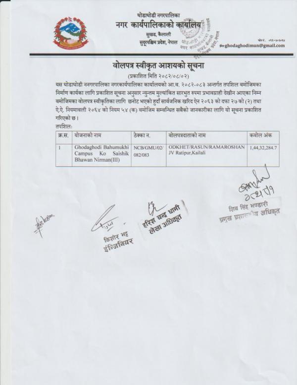 बोलपत्र स्वीकृत आशयको सूचना ।