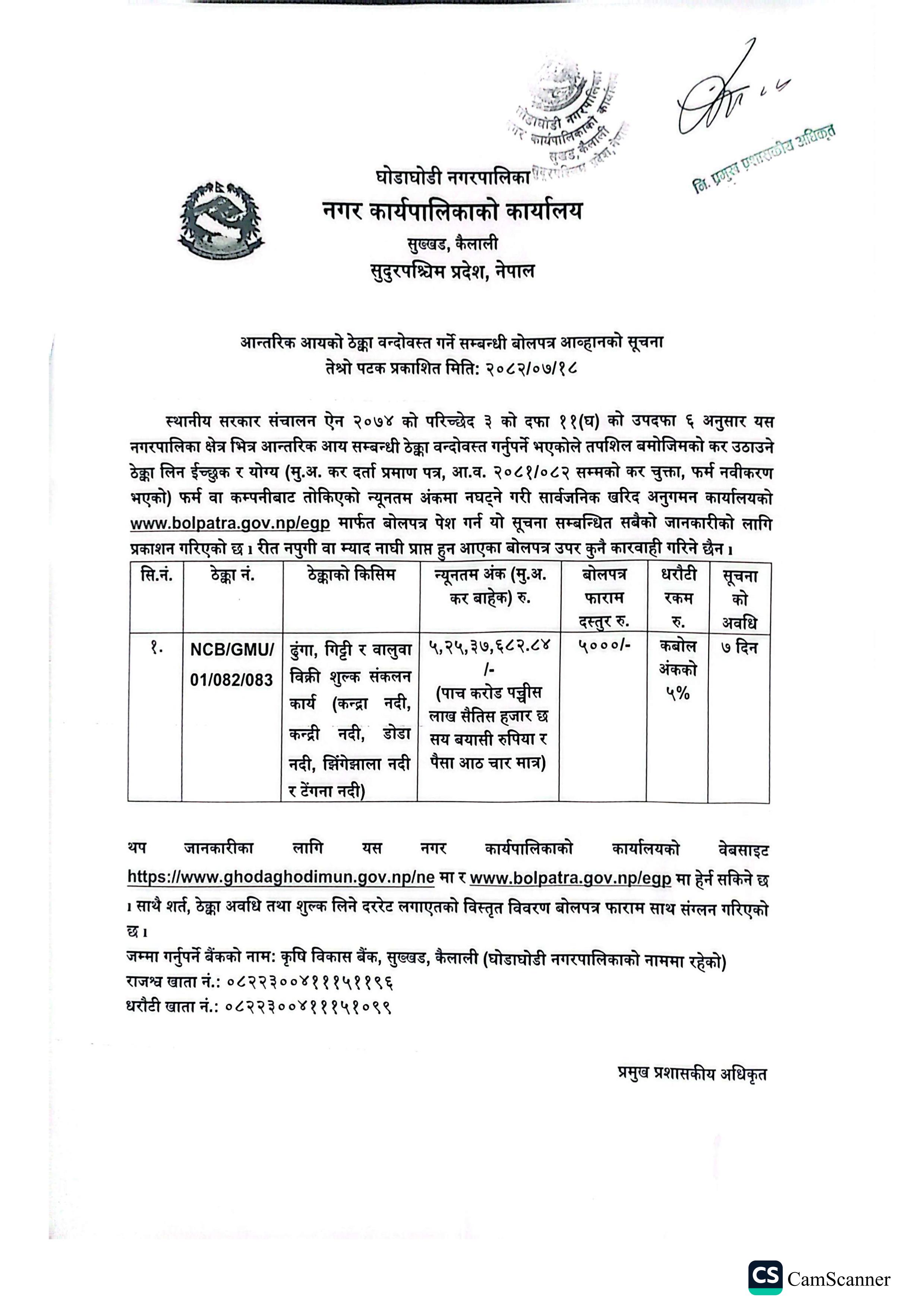 ढुंगा, गिट्टी र बालुवा बिक्री शुल्क संकलन कार्य ( कन्द्रा नदी, कन्द्री नदी, डोडा नदी, झिंगेझाला नदी र टेंगना नदी) ठेक्का नं. NCB/GMU/01/082/083 तेश्रो पटक प्रकाशित मिति २०८२।०७।१८ गते