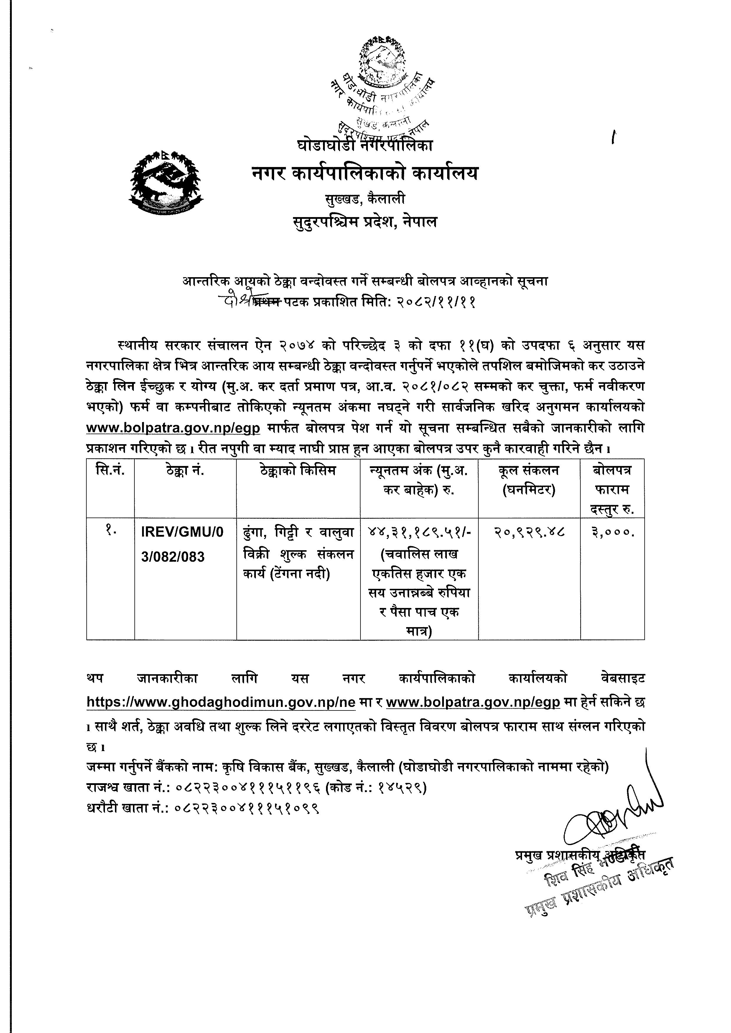 ढुंगा, गिट्टी र वालुवा विक्री शुल्क संकलन कार्य (कन्द्रा नदी, कन्द्री नदी,डोडा नदी, झिंगेझाला नदी र टेंगना नदी) ठेक्का नं.:IREV/GMU/03/082/083