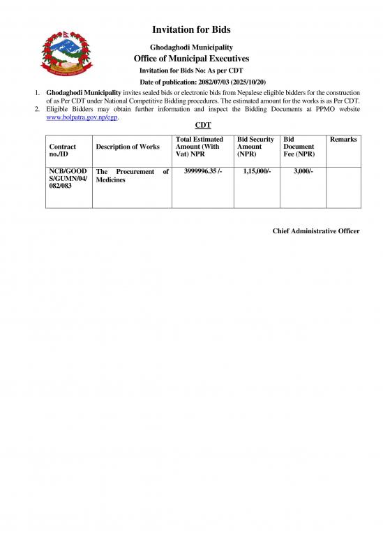 औषधी खरिद सम्बन्धि सूचना । ठेक्का नं. NCB/GOODS/GUMN/04/082/083 प्रथम पटक प्रकाशित मिति २०८२।०७।०३ गते