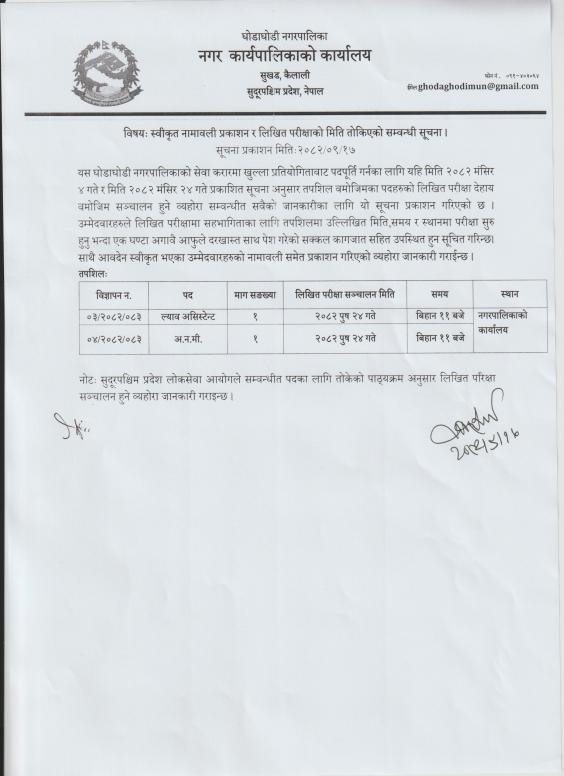 स्विकृत नामावली प्रकाशन र लिखित परिक्षाको मिति तोकिएको सम्बन्धी सूचना ।