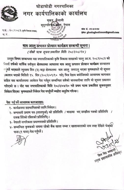 थारू आलु उत्पादन प्रोत्साहन कार्यक्रम सम्बन्धी सूचना ।