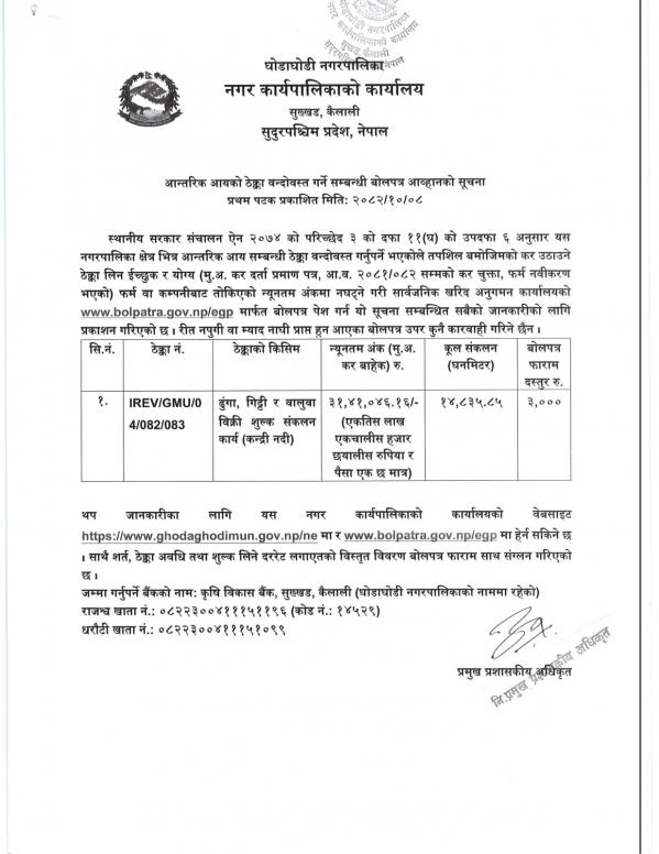 आन्तरिक आयको ठेक्का बन्दोबस्त गर्ने सम्बन्धी बोलपत्र आह्वानको सूचना । ठेक्का नंं. IREV/GMU/04/082/083