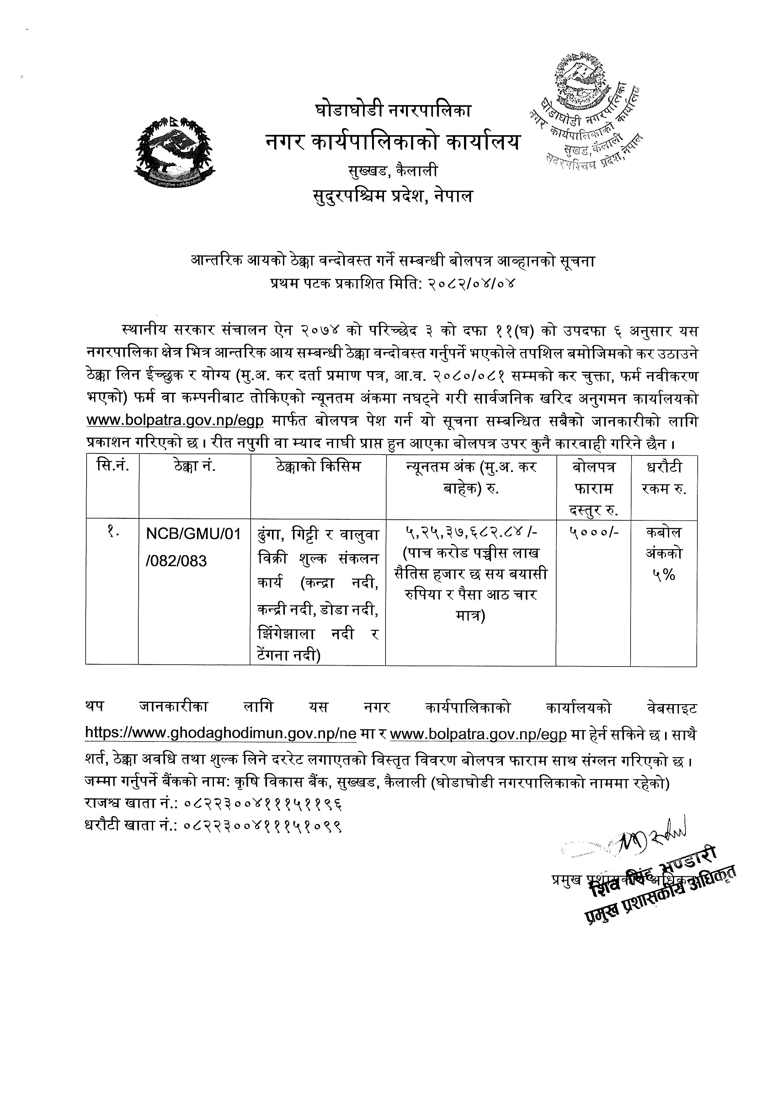 ढुंगा, गिट्टी र बालुवा बिक्री शुल्क संकलन कार्य ( कन्द्रा नदी, कन्द्री नदी, डोडा नदी, झिंगेझाला नदी र टेंगना नदी) ठेक्का नं. NCB/GMU/01/082/083