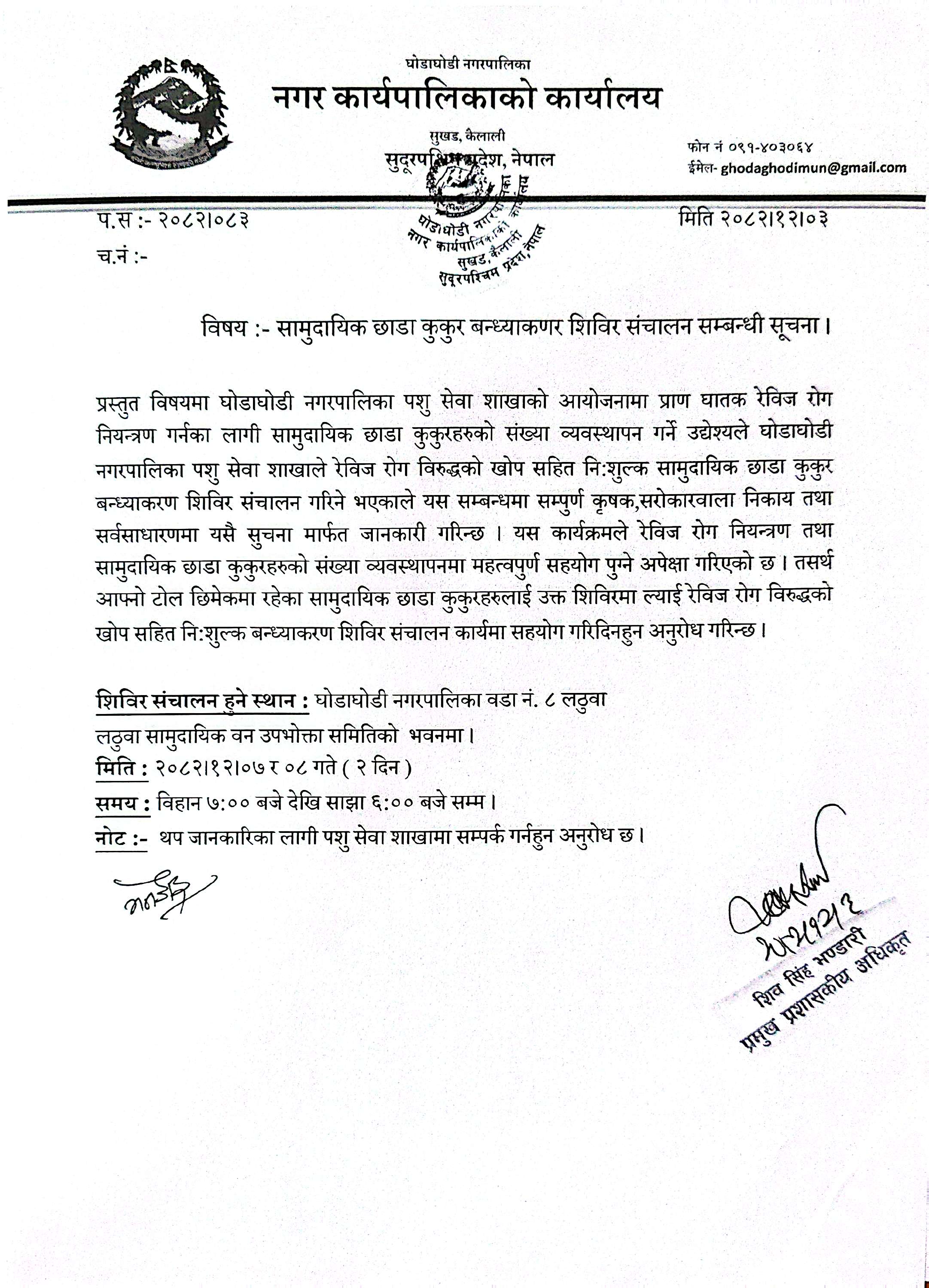 सामुदायिक छाडा कुकुर हरुलाइ रेविज रोग विरुद्ध को खोप सहित वन्ध्याकरण शिविर संचालन हुने बारे सूचना